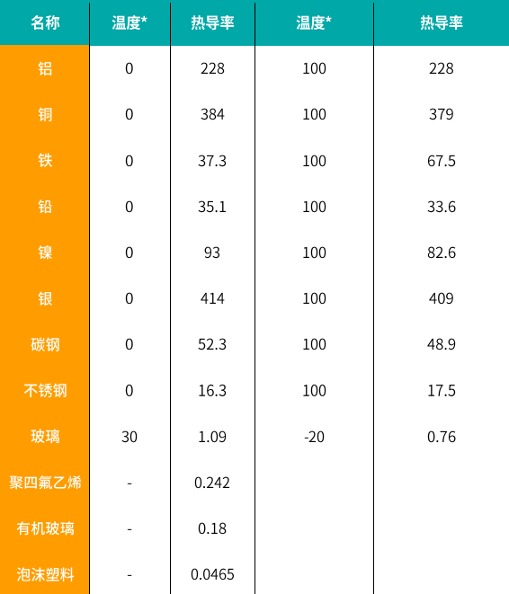 由此可見,總傳熱系數收到兩側流體的對流傳熱系數、間壁熱導率和壁厚的共同影響。間壁熱導率相對固定,如下表所示有一部分常見材料的熱導率: