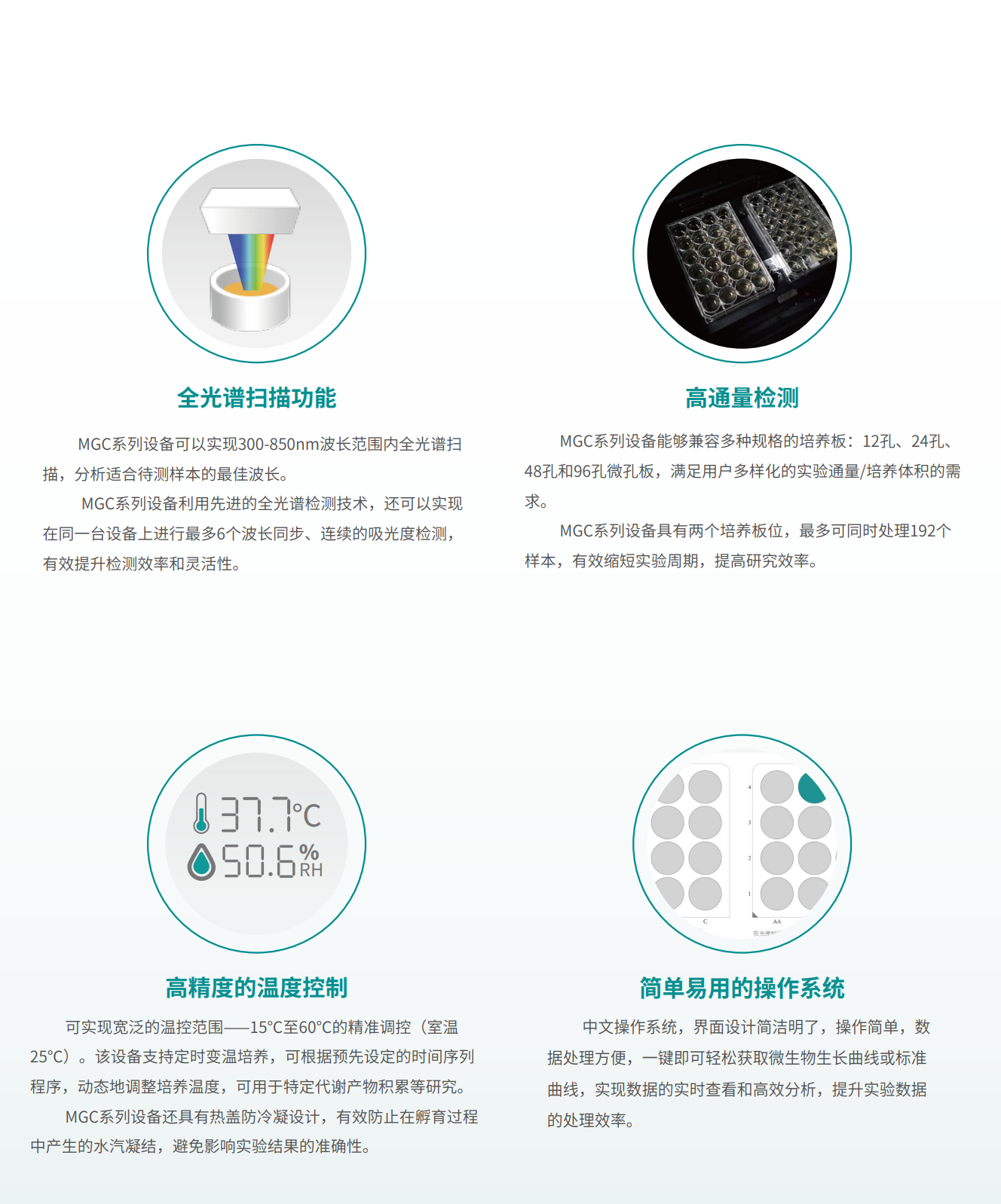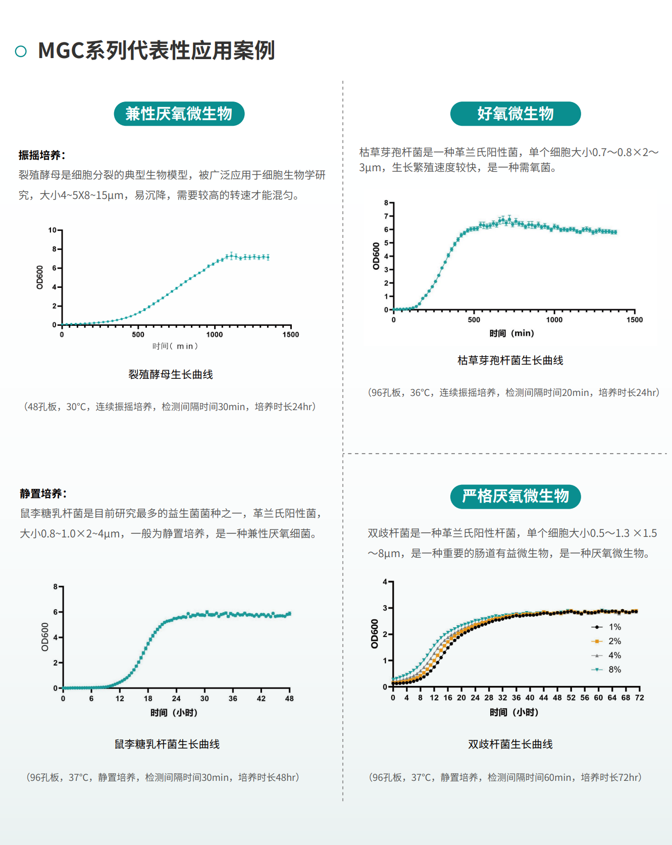 MGC-500微生物生長(zhǎng)曲線分析儀可以實(shí)現(xiàn)不同培養(yǎng)溫度、氣體環(huán)境、振搖狀態(tài)和光照組合下的微生物生長(zhǎng)狀態(tài)實(shí)時(shí)檢測(cè),而且整個(gè)過程無需人工頻繁取樣,也無需人員值守,大大降低了污染風(fēng)險(xiǎn),真正實(shí)現(xiàn)了人力的解放和研究效率的提升。